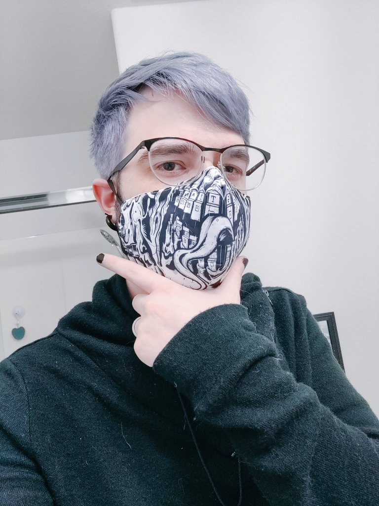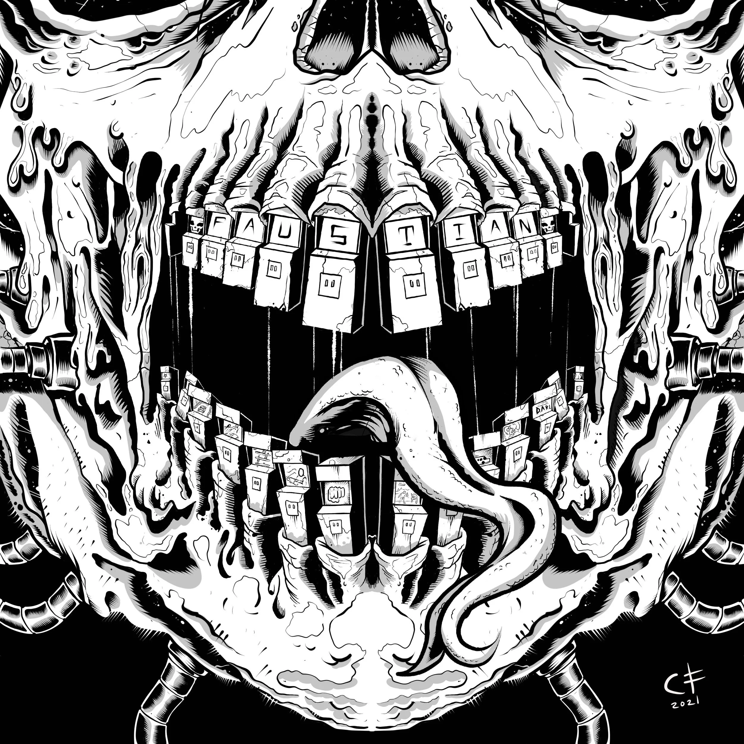 This illustration was used for a face mask for the fighting game team Faustian and sold as merch on their website at www.faustianfgc.com. It is drawn in a way that coincides with the lower part of the human face. You know, nose, mouth, chin, everything a face mask covers. Not only does it make you look like a scary monster but it can also be beneficial to your health. The images below are of the original art used for the mask, some images of the mask in wear, and other used during a gaming competition.