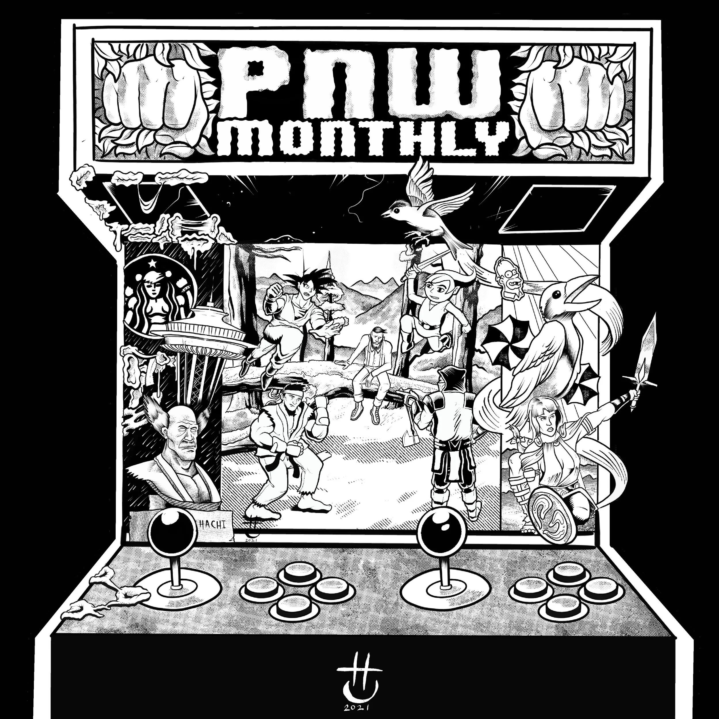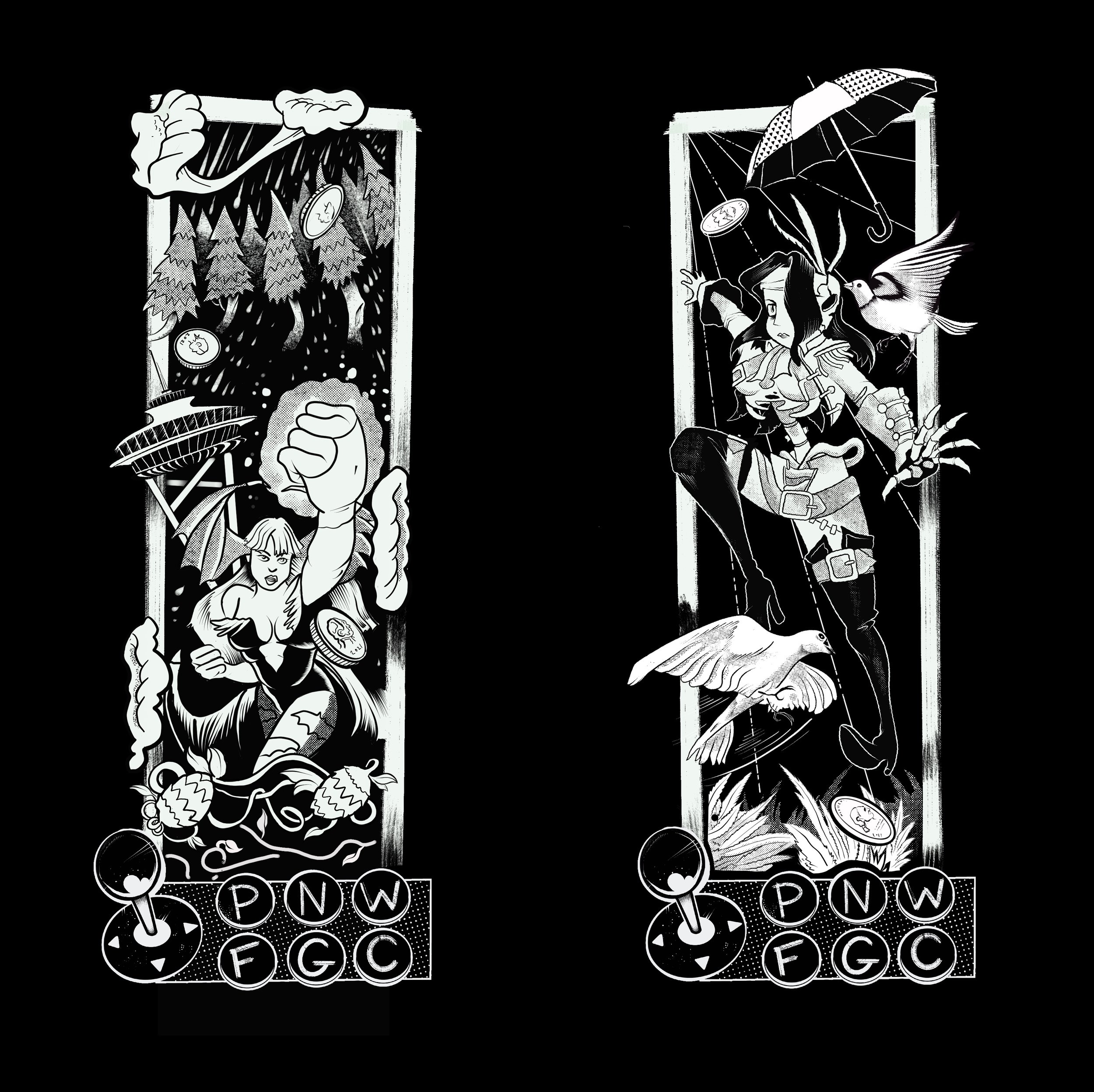 The art below was used for a t-shirt in promotion of an ongoing video game fighting tournament. The second piece is an unused piece of art intended for a long sleeve. The photos below are of illustration on the shirts.