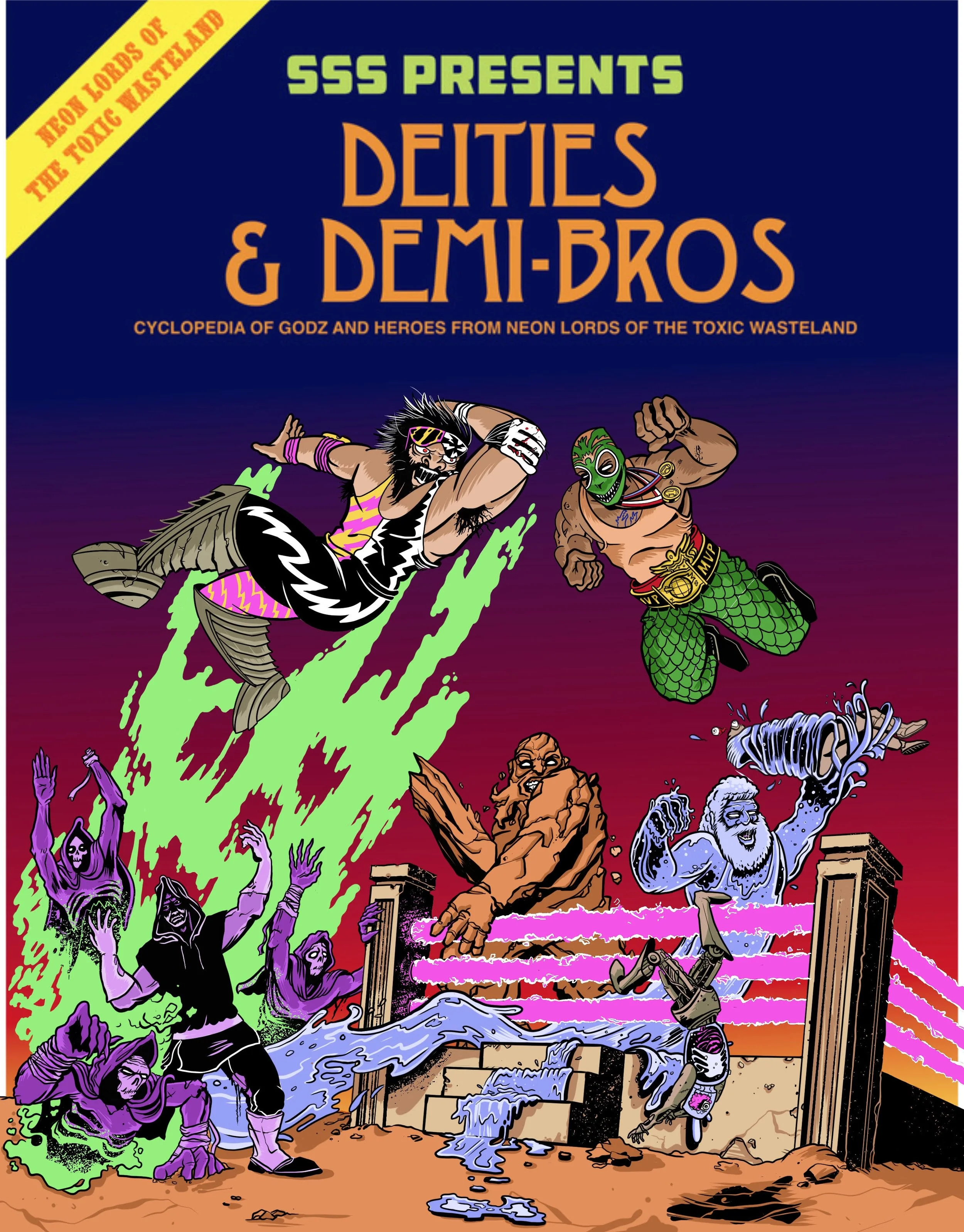Deities and Demi-Bros is the godz supplement for Neon Lords of the Toxic Wasteland, packed full of Lawful wrestling gods and Khaotic eldritch nightmares best left under the bed. Deadly Dudez/Toxic Creeps is a manual of monsters for scumdogs of all levels